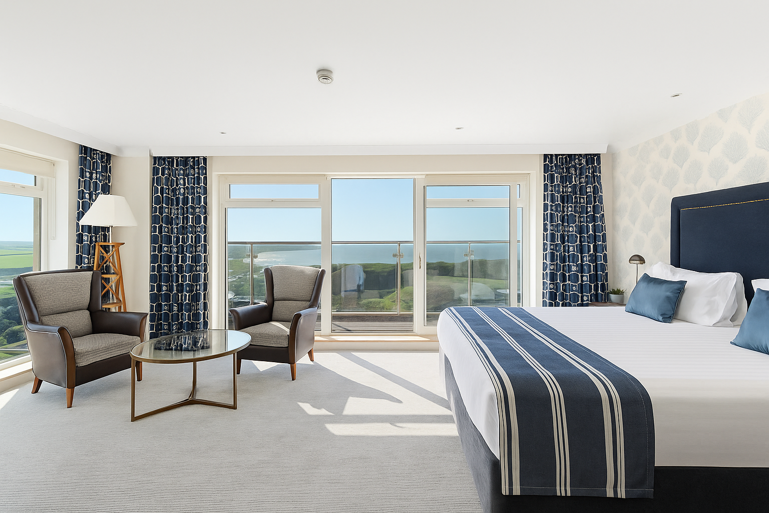 Prestigious rooms with a large bedroom, separate side room and luxury bathroom. Enjoy spectacular double-aspect views out over Thurlestone Bay and your own private balcony.